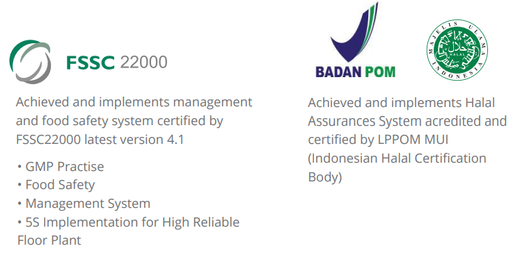 excellent in quality, innovative, hygiene and nutritious that meets the standard of food quality and safety and supported by reliable human resources, creativity, and sufficient food processing technology.